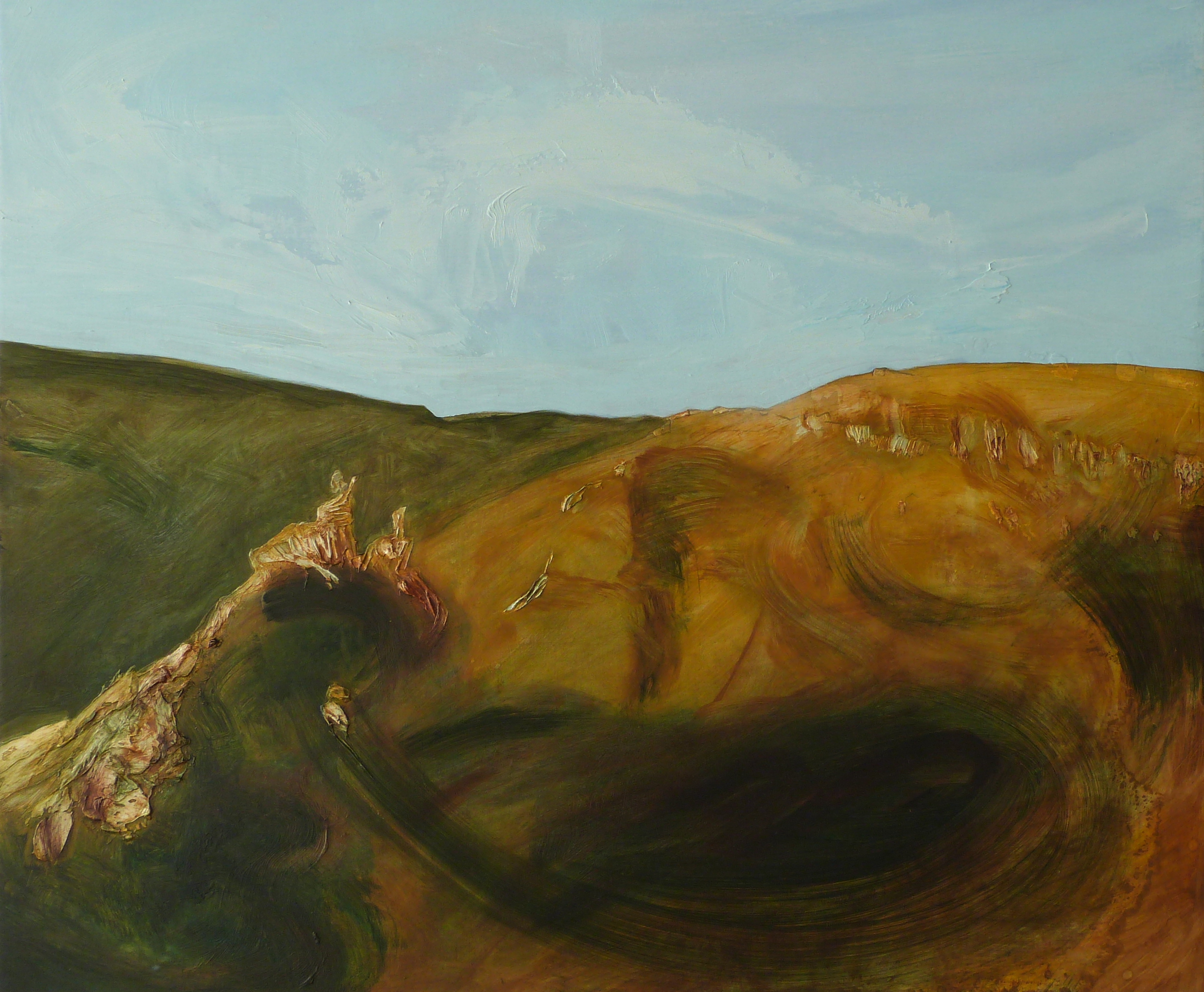 feature in the Peak District, Derbyshire. The gritstone debris from this landslide towers over the valley for over half a mile; from a distance, the protruding mounds resemble castles. The instability of the site is reflected in Goodwin’s poem, which is also a response to Evans’ painting; you can view the poem and the painting here.