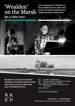 On Saturday 14 May, Skep Arts presents a rare performance of Wealden at the Church of St Augustine (Brookland, Romney Marsh, Kent, TN29 9QP). First performed and recorded just before lockdown, Wealden is a collaboration between Nancy Gaffield and the three members of The Drift (Darren Pilcher, Rob Pursey, Amelia Fletcher). Nancy’s poem is inspired by a walk across Romney Marsh, from the Weald to Dungeness, and concerns itself with the ecology, human history and longer-term environmental history of this unique landscape. The Drift’s music offers gentle but powerful accompaniment, combining harmonium, bass, vocals, and glockenspiel with a constantly evolving series of sound loops, which are generated from the grasses, stones and rushes that can be found on the Marsh. This performance of Wealden will be prefaced by an optional gathering at Fairfield Church (TN29 9RY) at 4pm, followed by a walk across the marsh to Brookland Church (approx 1 hour). The performance at Brookland Church will start at 7.30pm (doors 7pm). At Brookland Church there will be a pop-up bar with beer, wine, and non-alcoholic beverages. Click here for further details of the event. Click here for map/location details and to book tickets. Wealden was published as a pamphlet and audio CD by Longbarrow Press in November 2020. Click here for further details (and to order the pamphlet and CD).