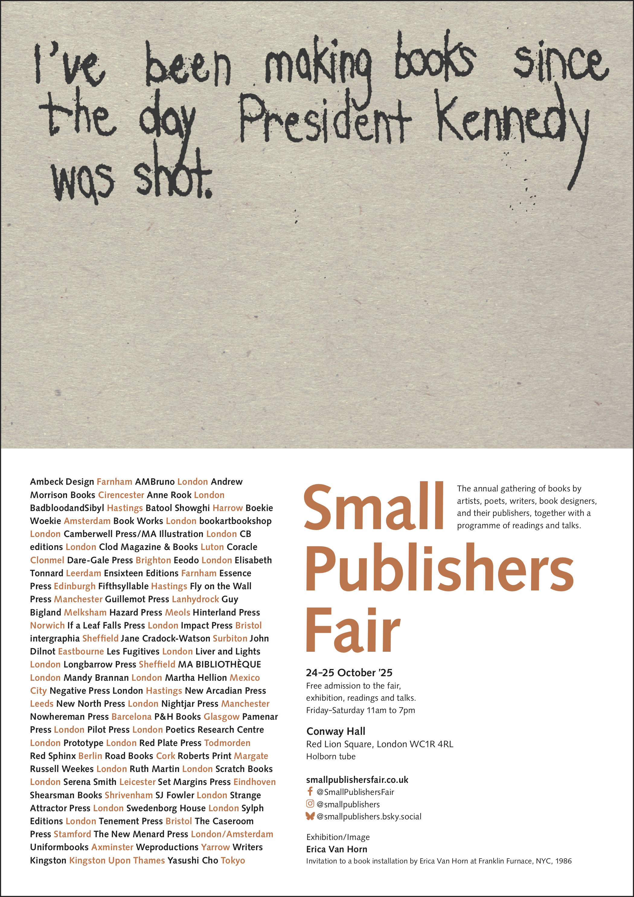 On Friday 24 and Saturday 25 October, the Small Publishers Fair returns to the Conway Hall in Holborn, London, showcasing the work of over 60 publishers from across the UK and around the world, with an exhibition and a varied programme of readings and talks. Longbarrow Press will be among the stallholders (alongside Intergraphia) over the two days of the fair; we’ll have a full range of titles available to browse and buy. The fair is open from 11am to 7pm, with programmes of readings and talks in the afternoons (free, no booking required). Conway Hall, 25 Red Lion Square, Holborn, London, WC1R 4RL. Admission free; all welcome. Click here for more details.