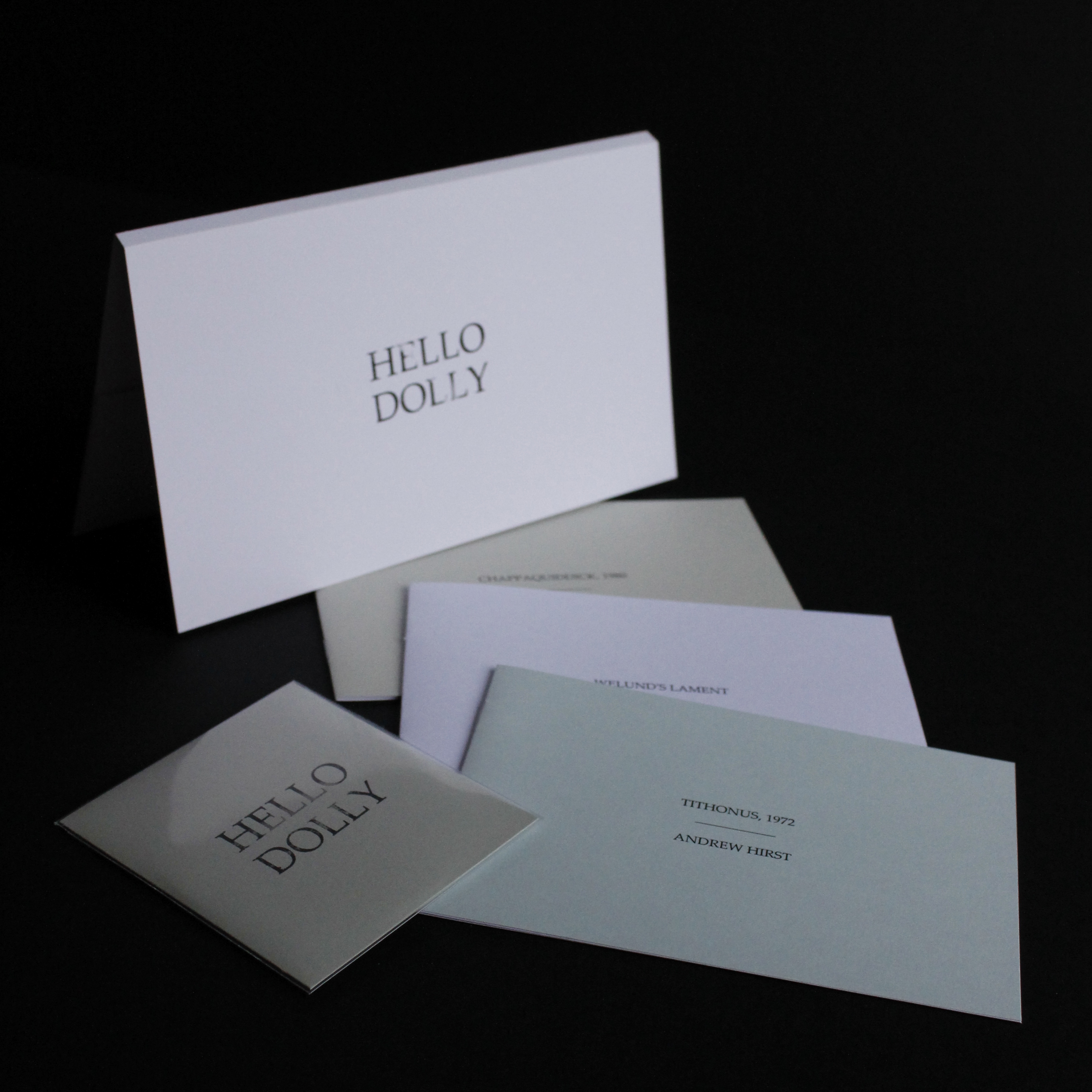 2012. Three landscape-format pamphlets and a 3″CD in a handmade, hand-stamped wallet. Listen to ‘Welund’s Lament’ here. Click here for a short film of ‘Chappaquiddick, 1980’. Listen to (and download) a podcast of Hirst discussing ‘Hello Dolly’ and a wide range of related topics: